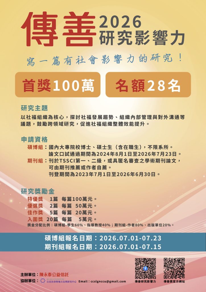 【轉知-論文獎】「2026傳善研究影響力」論文徵件